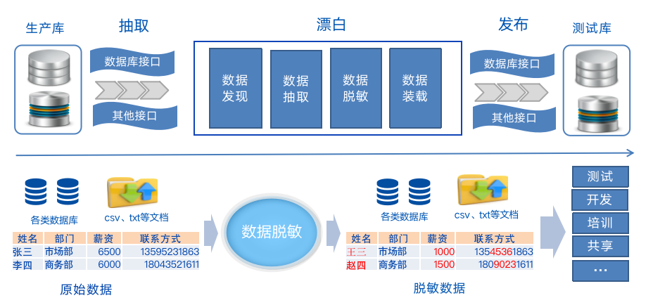 针对开发、测试、培训、分析人员等非实时数据应用场景,将数据抽取进行模糊化,混淆化处理后,下发至测试库,并进行读写操作,脱敏后的数据与生产环境隔离,满足业务需要的同时保障生产数据库的安全,静态脱敏可以概括为数据的“搬移并仿真替换”